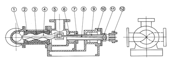I-1BB型:殼體鑄件,傳動(dòng)件(主軸、螺桿和繞軸)為2Cr13不銹鋼制造,適用于一般中性濃漿液輸送,一般微酸、堿漿液輸送。
