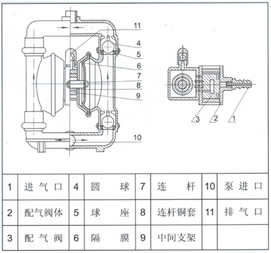 10、本氣動(dòng)隔膜泵無須用油潤滑,即使空轉(zhuǎn),對泵也無任何影響,這是該氣動(dòng)隔膜泵一大特點(diǎn)。